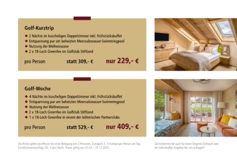 Einzelzimmerzuschlag: 20,- € pro Nacht. Preise gültig von 01.01. - 31.12.2025. ein individuelles Angebot bei uns anfragen!